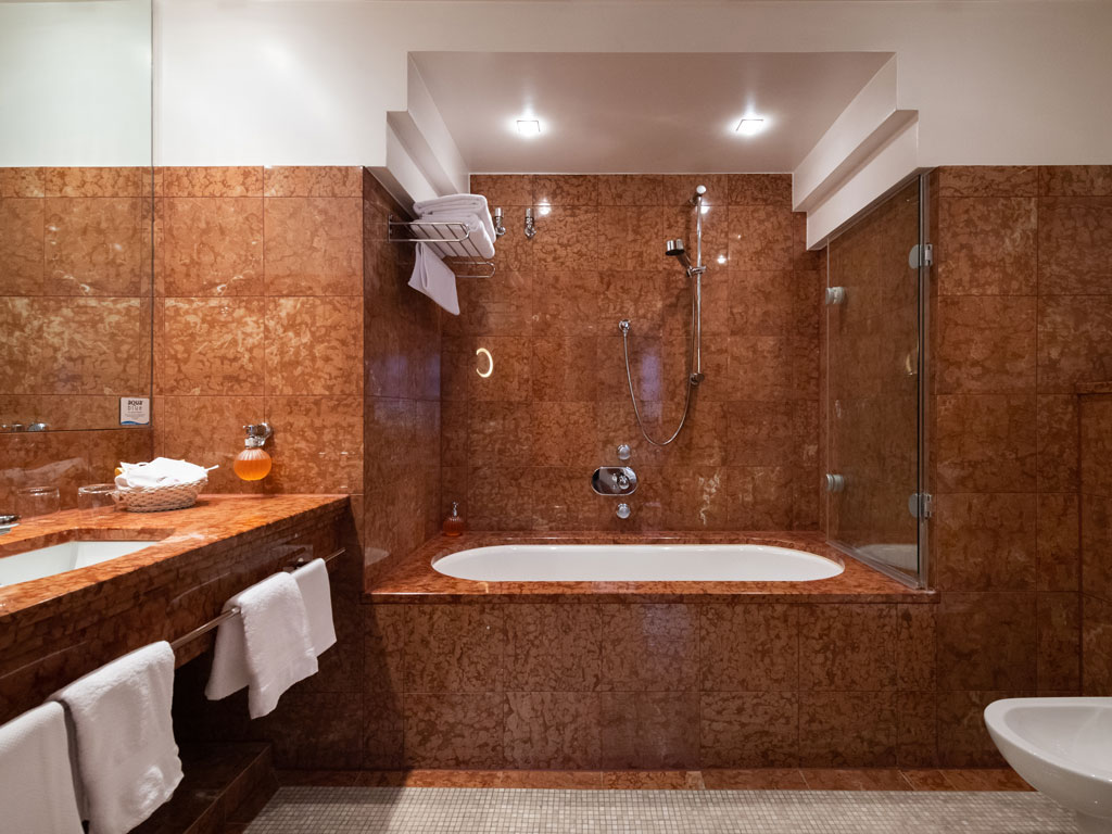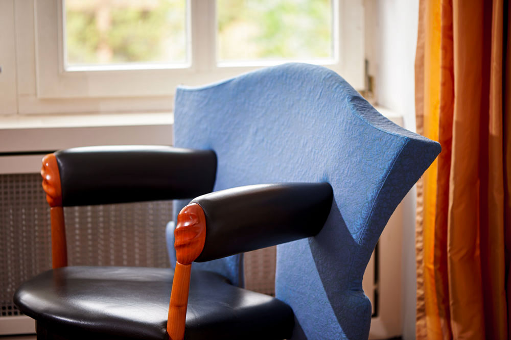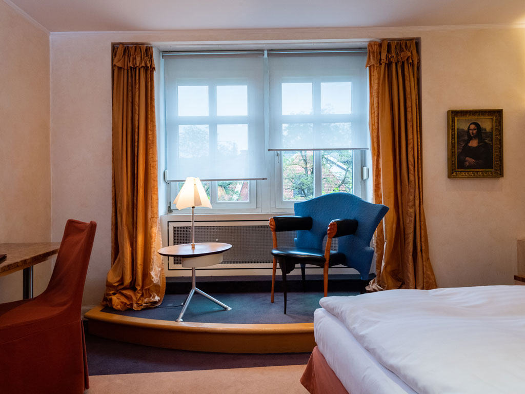 Wer mediterranes Ambiente mag, wird sich in diesem Zimmer wohlfühlen. Natürlich-erdige Farben und viel Licht kombiniert mit stilvollem Mobiliar und Kunst-Impressionen von Weltrang bringen dieses besondere Flair in den Goldenen Karpfen.